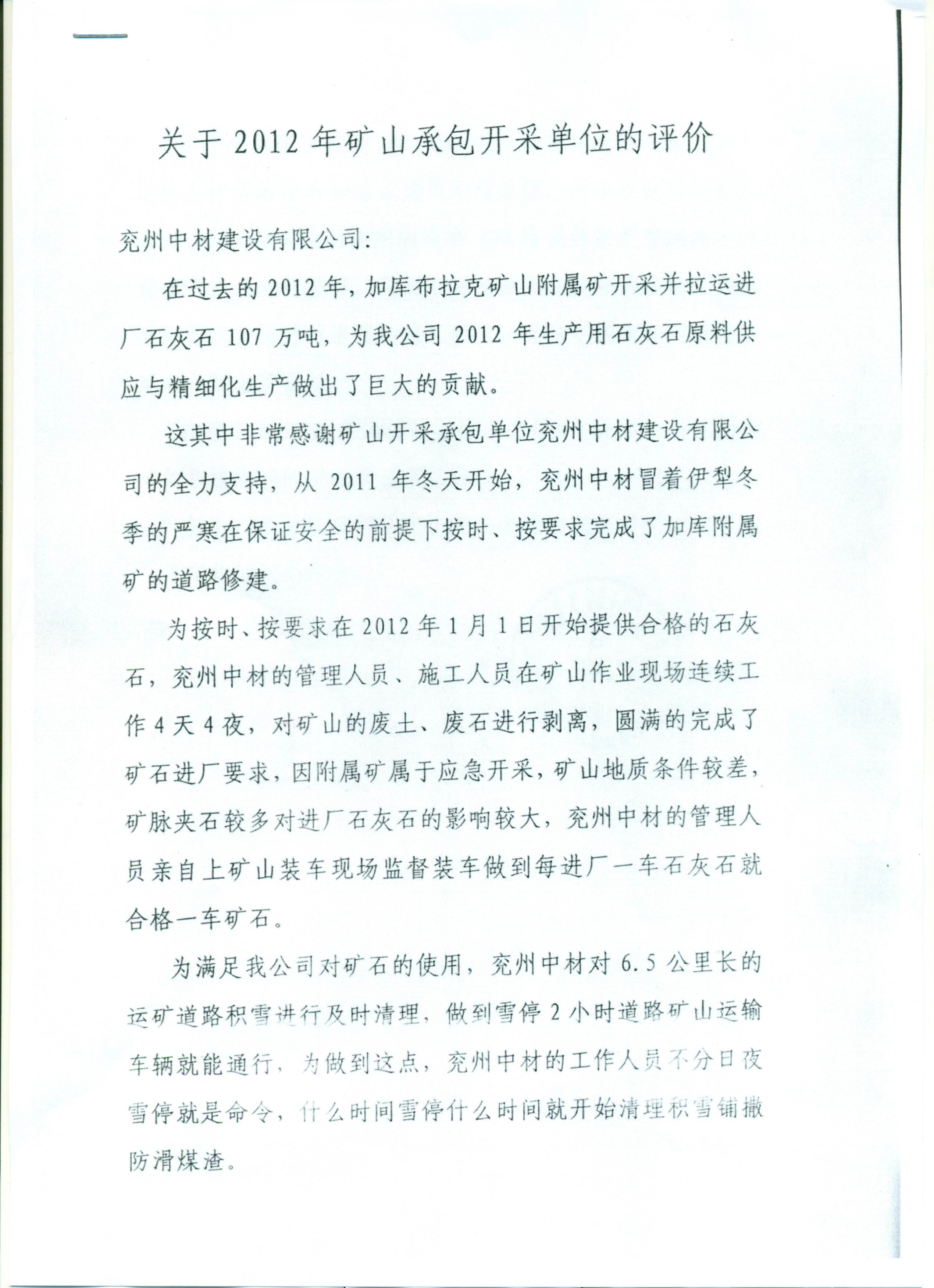 伊犁天山水泥有限責(zé)任公司對(duì)2012年礦山開(kāi)采承包單位的評(píng)價(jià)