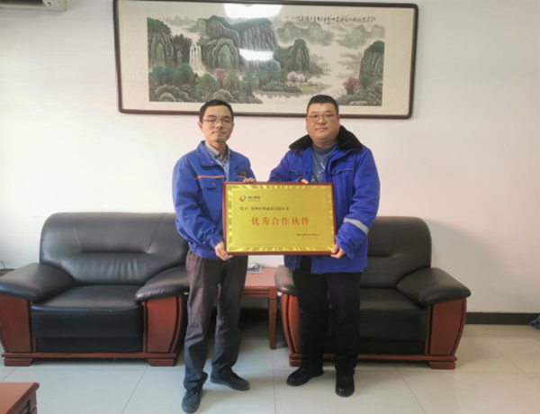 11月25日,為表彰兗州中材神頭分公司對朔州金圓水泥有限公司超額完成年度生產(chǎn)任務(wù)做出的積極貢獻(xiàn),金圓水泥副總經(jīng)理王魁向兗州中材建設(shè)有限公司神頭分公司頒發(fā)了“優(yōu)秀合作伙伴”的榮譽(yù)獎(jiǎng)牌。