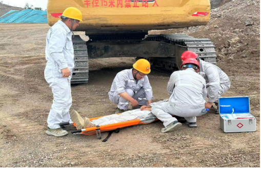 本次演練主要模擬515平臺發(fā)生車輛傷害事故,一名員工被挖機回轉(zhuǎn)時碰傷倒地,頭部撞擊受傷,傷情嚴重,進行緊急救援的情景。