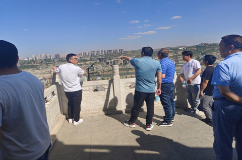來(lái)到觀景臺(tái)邊,大家回望著來(lái)時(shí)的路,它就在腳下,不由得心懷感激,內(nèi)心充滿著自豪感。向遠(yuǎn)處眺望,奔騰的黃河在拐過(guò)大“幾”字彎沖出晉陜蒙峽谷后,進(jìn)入晉陜兩省交界處變得特別溫順,母親河的水也變得特別清澈,該段也是黃河唯一一段自東向西的流向,看著奔流不息的黃河水,寓意著中華文明源遠(yuǎn)流長(zhǎng),偉大的中國(guó)共產(chǎn)黨生生不息!